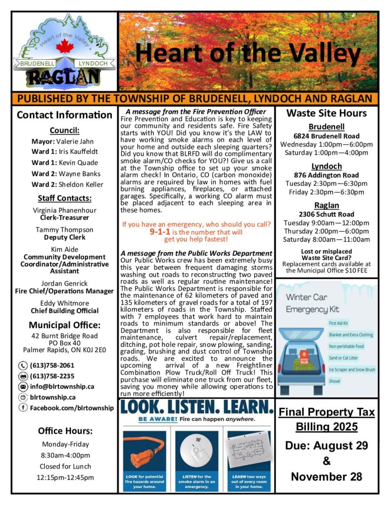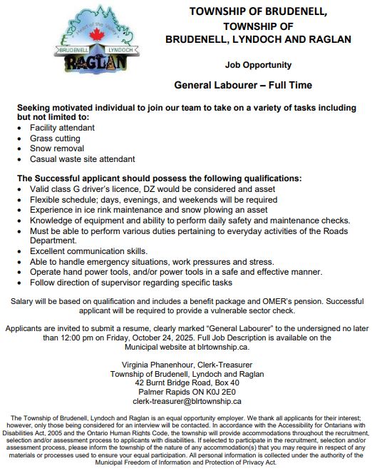 Located in the southwest edge of Renfrew County, Brudenell, Lyndoch and Raglan is home to several canoe and kayak shops, wilderness adventure industries, second generation logging companies and many small businesses that thrive in our community. The hamlets of Palmer Rapids, Brudenell, Quadeville, Hardwood Lake and more are nestled in this rural and heavily forested township with 60,000 hectares of bush that supports the logging industry and surrounds the lush farmland.